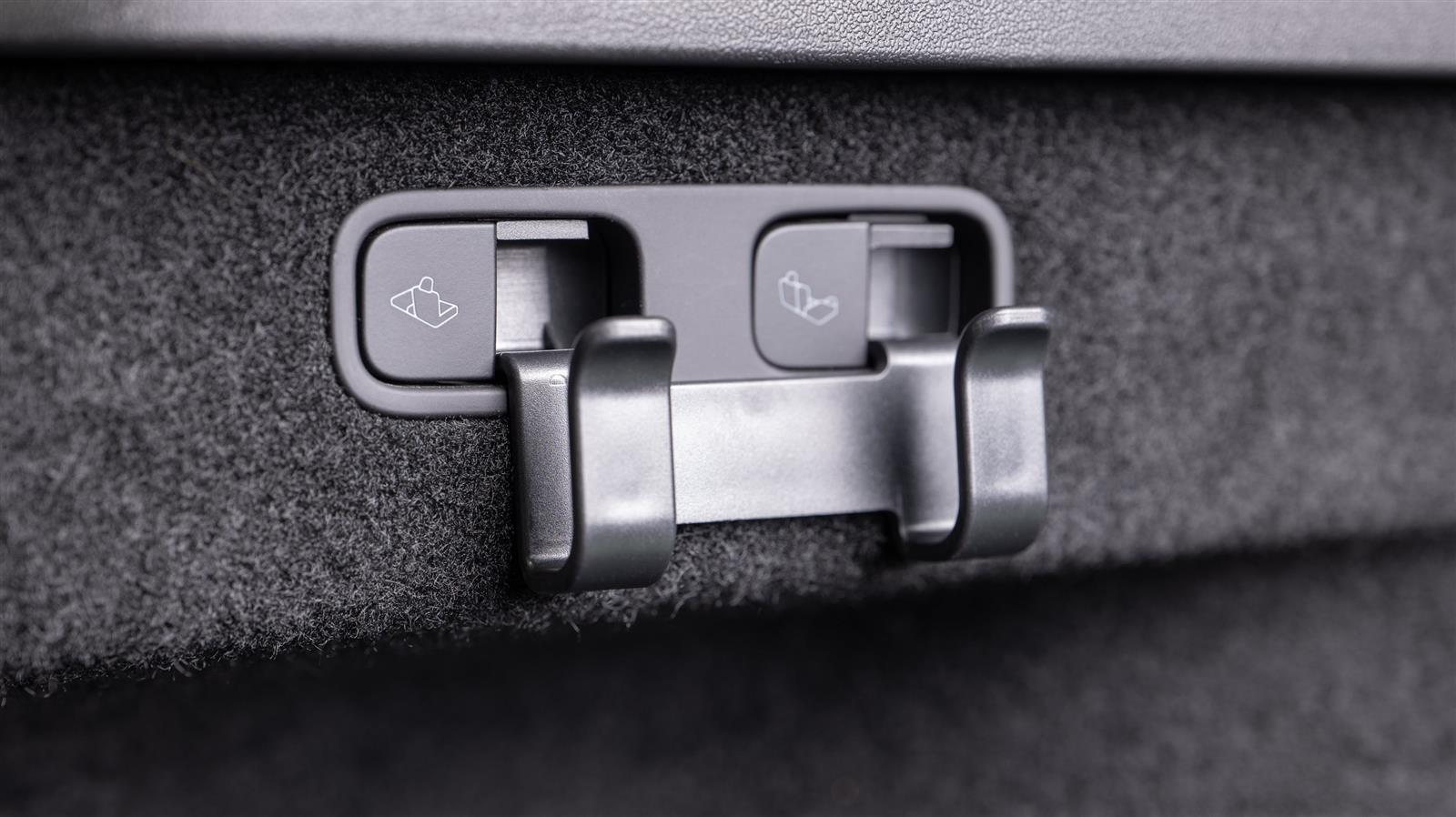 Dieser praktische Kofferraum Haken verhindert, dass Taschen, Rucksäcke oder Einkaufstaschen im Kofferraum deines Tesla Model Y umherfliegen. Der Kofferraum Doppelhaken für Tesla Model Y wird schraubenlos montiert, er kann einfach zwischen die Sitzentriegelungen eingehängt werden. Die Schalter sind trotzdem noch zu bedienen.