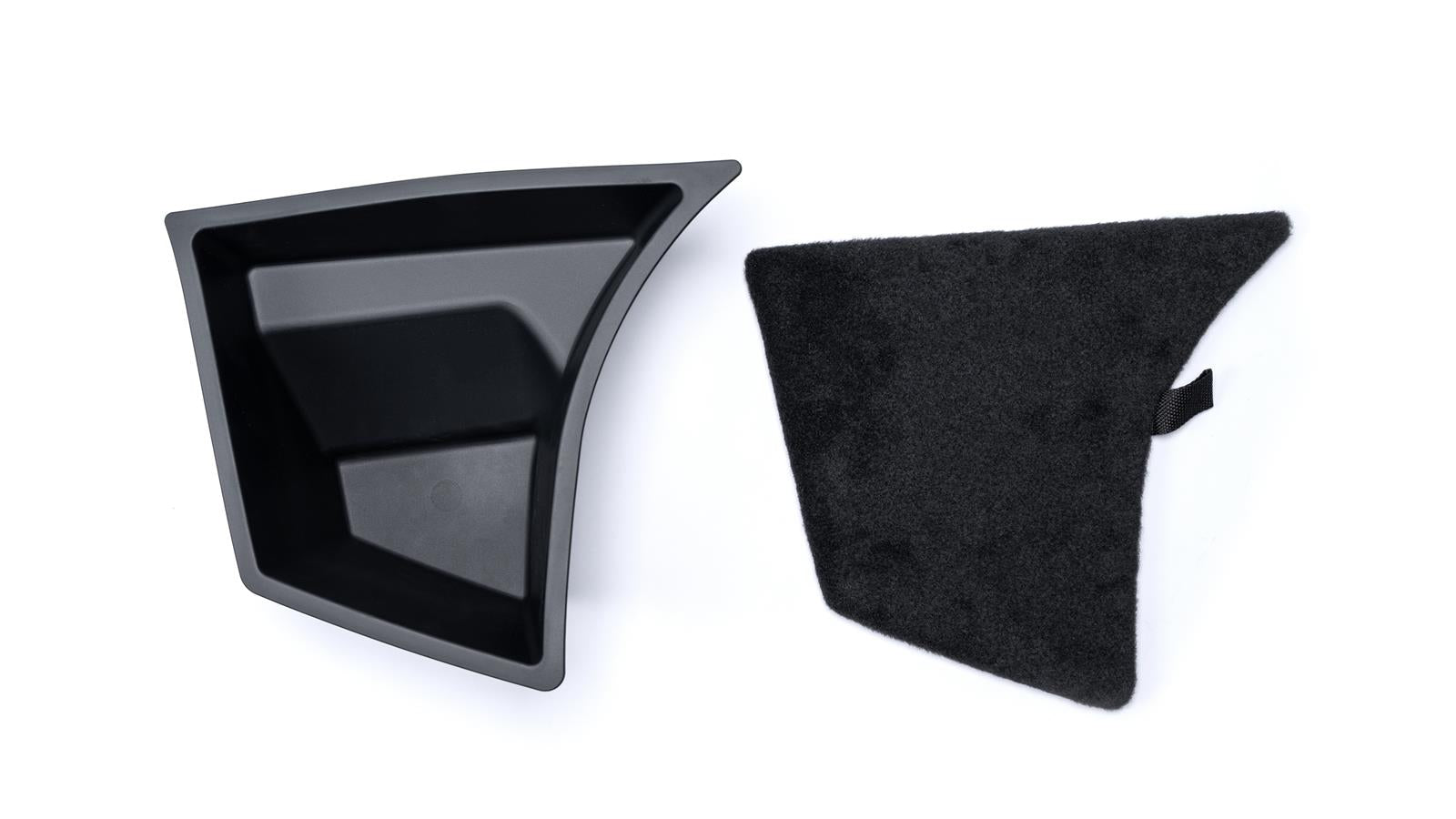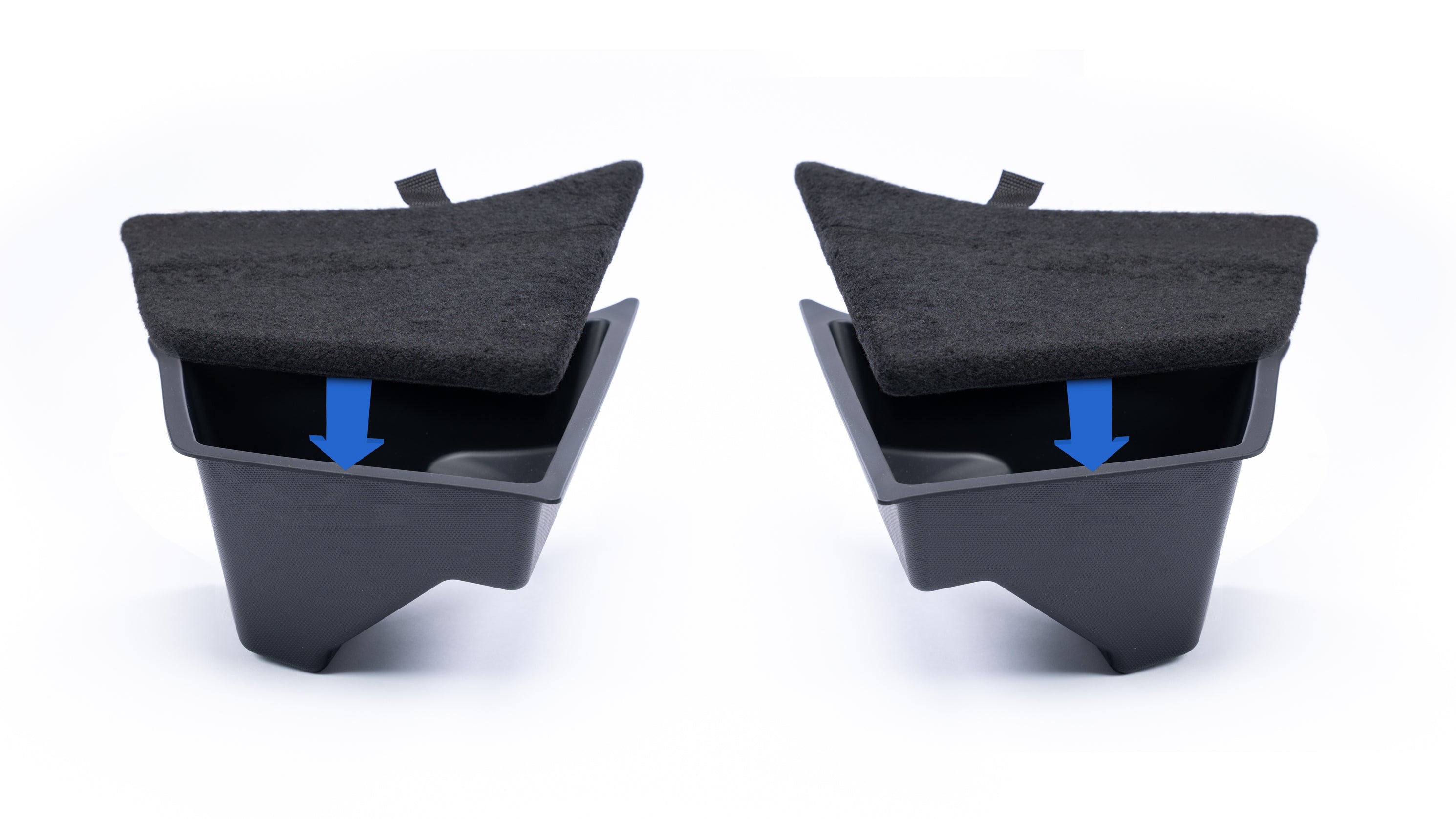 Für das Tesla Model 3 bieten wir einen Gummieinsatz für die seitlichen Kofferraumfächer an. Hergestellt aus langlebigem Material und passgenau für das Model 3, bietet dieser Einsatz einen festen Sitz ohne zu wackeln. Der Deckel besteht aus dem gleichen Material wie die Kofferraumverkleidung, sodass das Fach nahezu unsichtbar ist. Eine praktische Schlaufe am Deckel erleichtert das Öffnen. Besonders praktisch ist, dass der Gummieinsatz leicht zu reinigen ist: Verschmutzungen können einfach mit einem feuchten Tuch oder Wasser abgespült werden. Der Einsatz ist für das aktuelle Tesla Model 3 "Highland" passend.