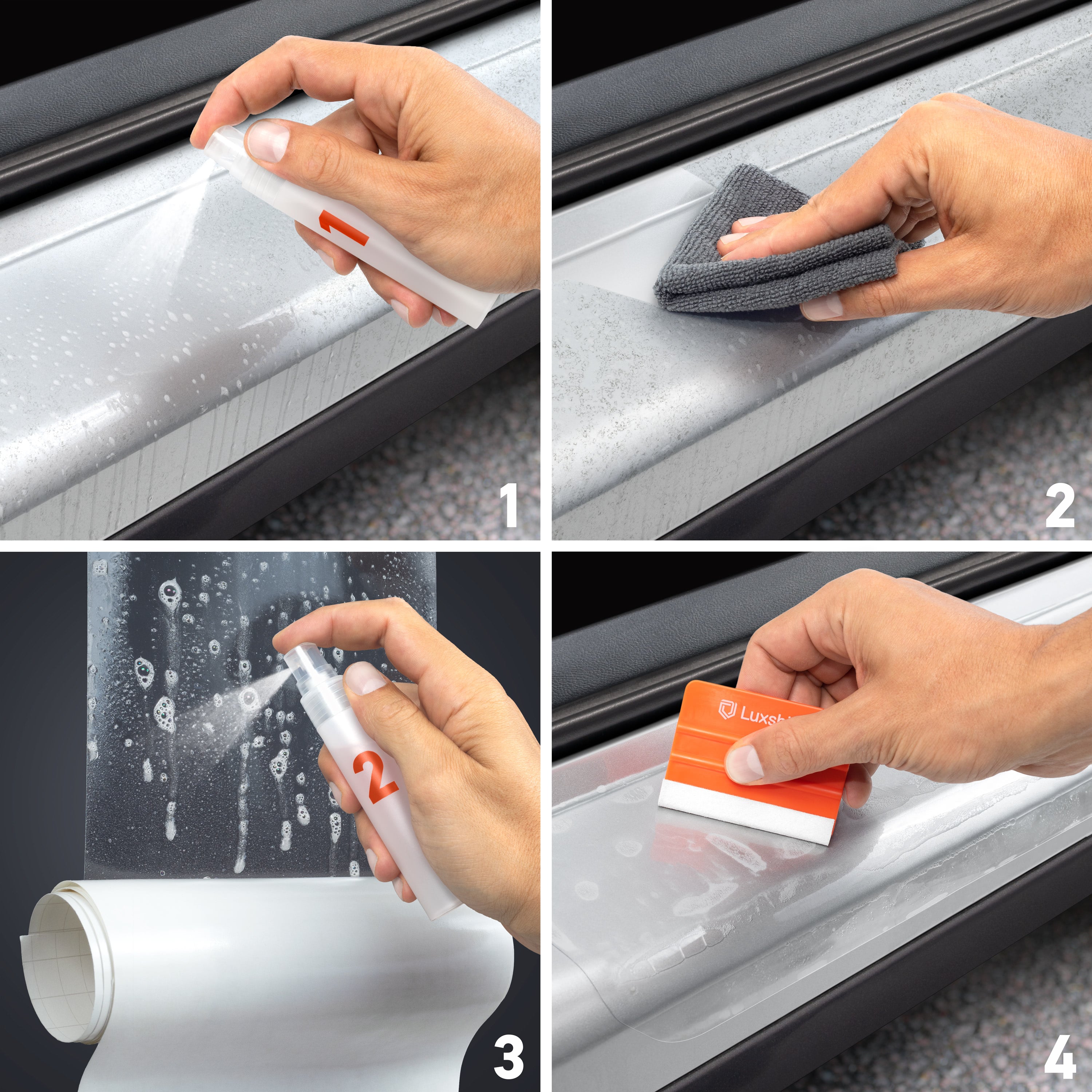 Mit im Lieferumfang enthalten ist ein Application Kit mit Rakel, Mikrofasertuch & Reinigungs- sowie Montageflüssigkeit. Die korrekte Anbringung kannst du dir vorher in einer Videoanleitung anschauen. Ein QR Code zum Video liegt der Packung bei.