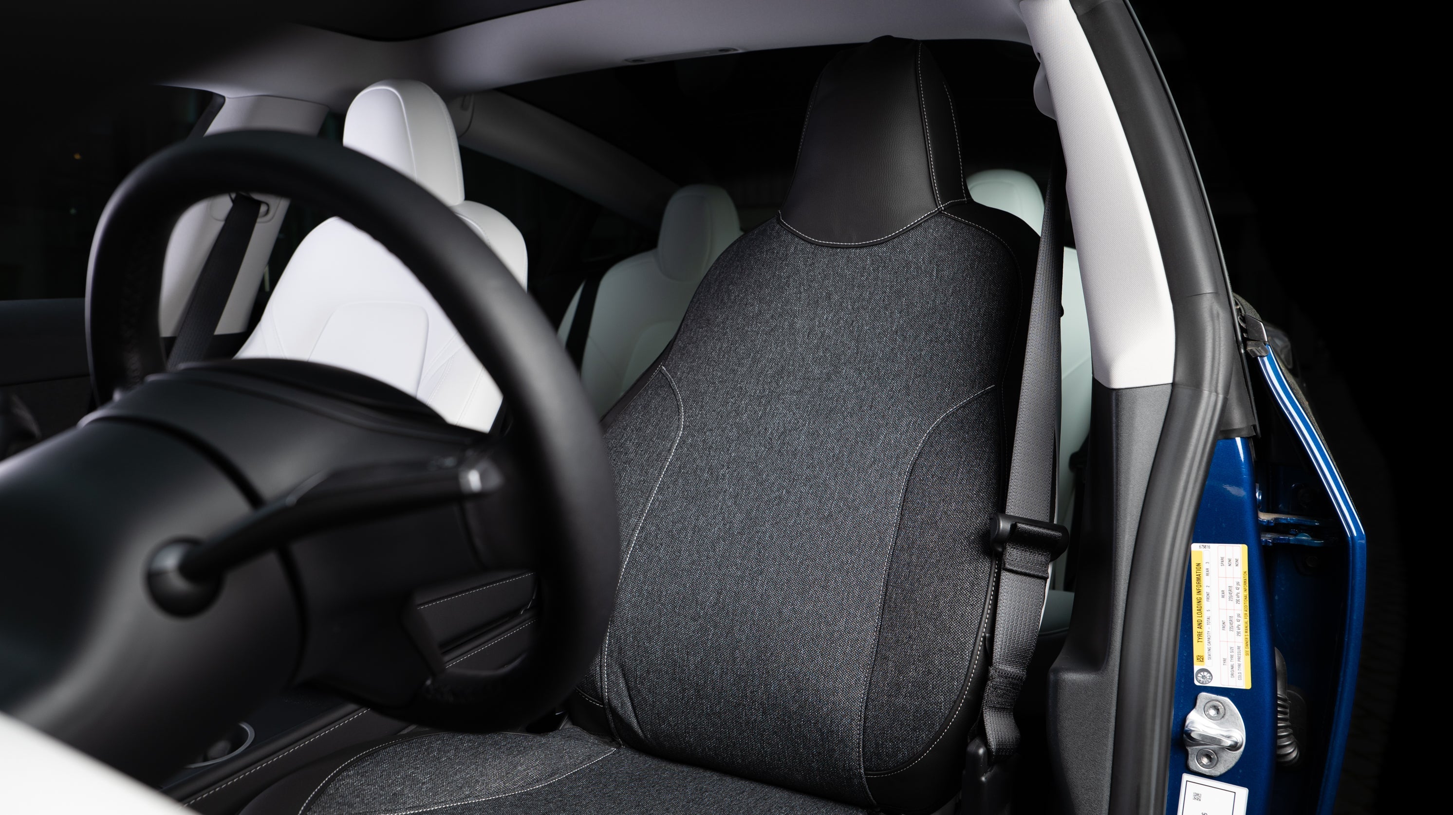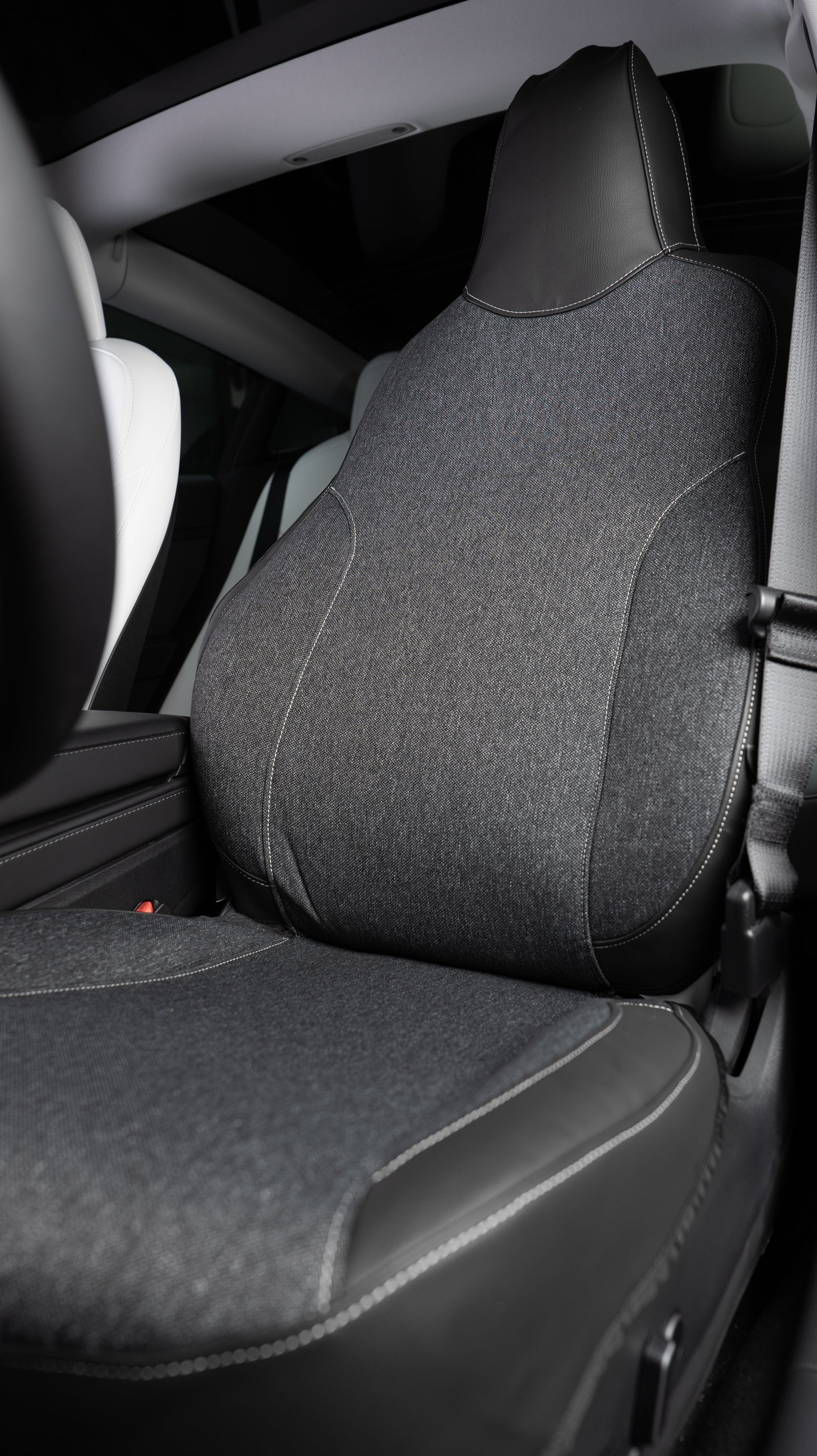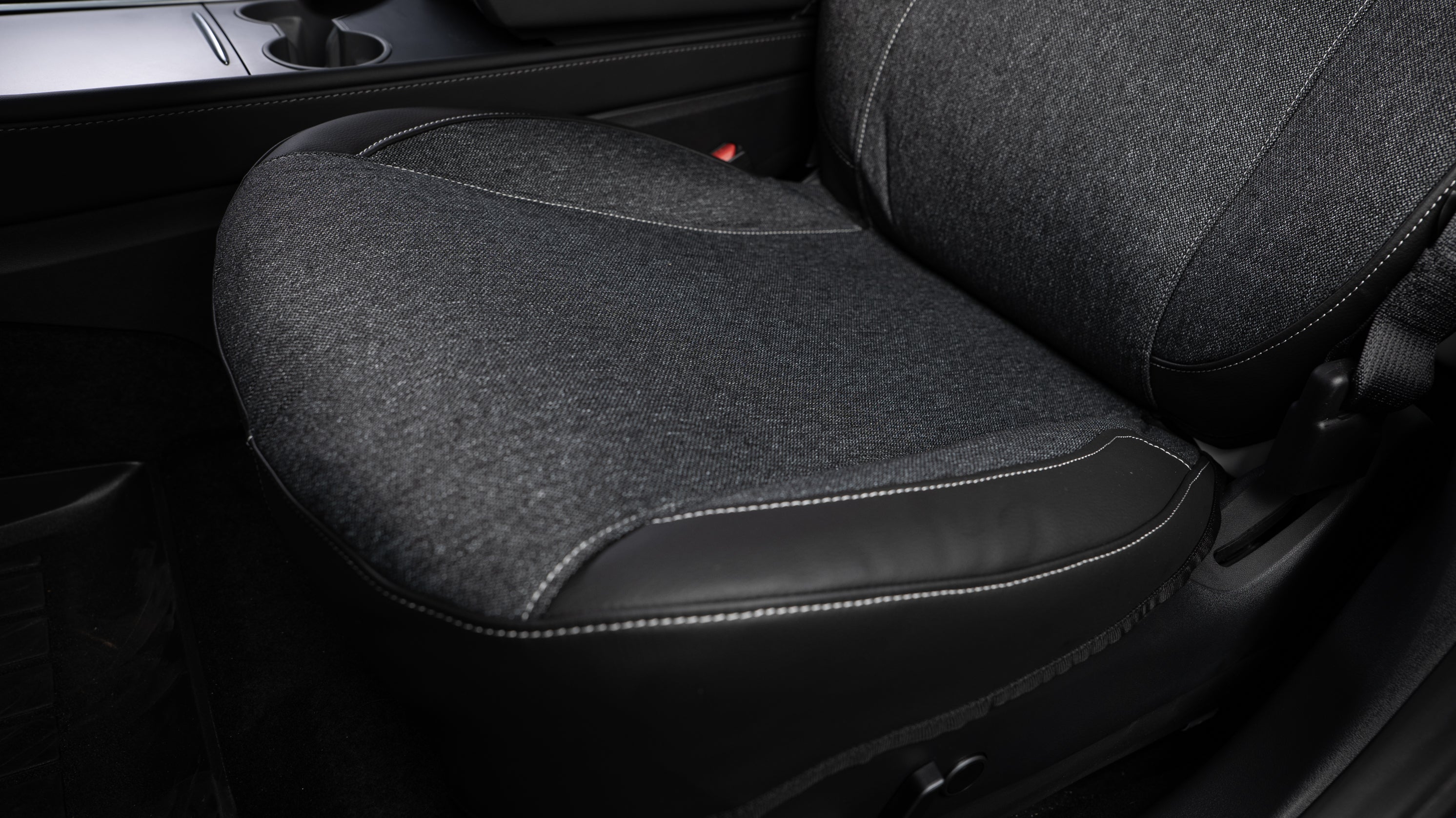 Unser 2befair Sitzbezug passt perfekt über einen der vorderen Sitze in deinem Tesla Model 3 oder Y. Hier setzten wir auf einen Recycling-Stoff in Verbindung mit Kunstleder. Der Sitzbezug bedeckt dabei die Rückenlehne vorne und Sitzfläche oben, geht aber nicht ganz nach hinten herum - die Hinterseite der Rückenlehne bleibt also frei.