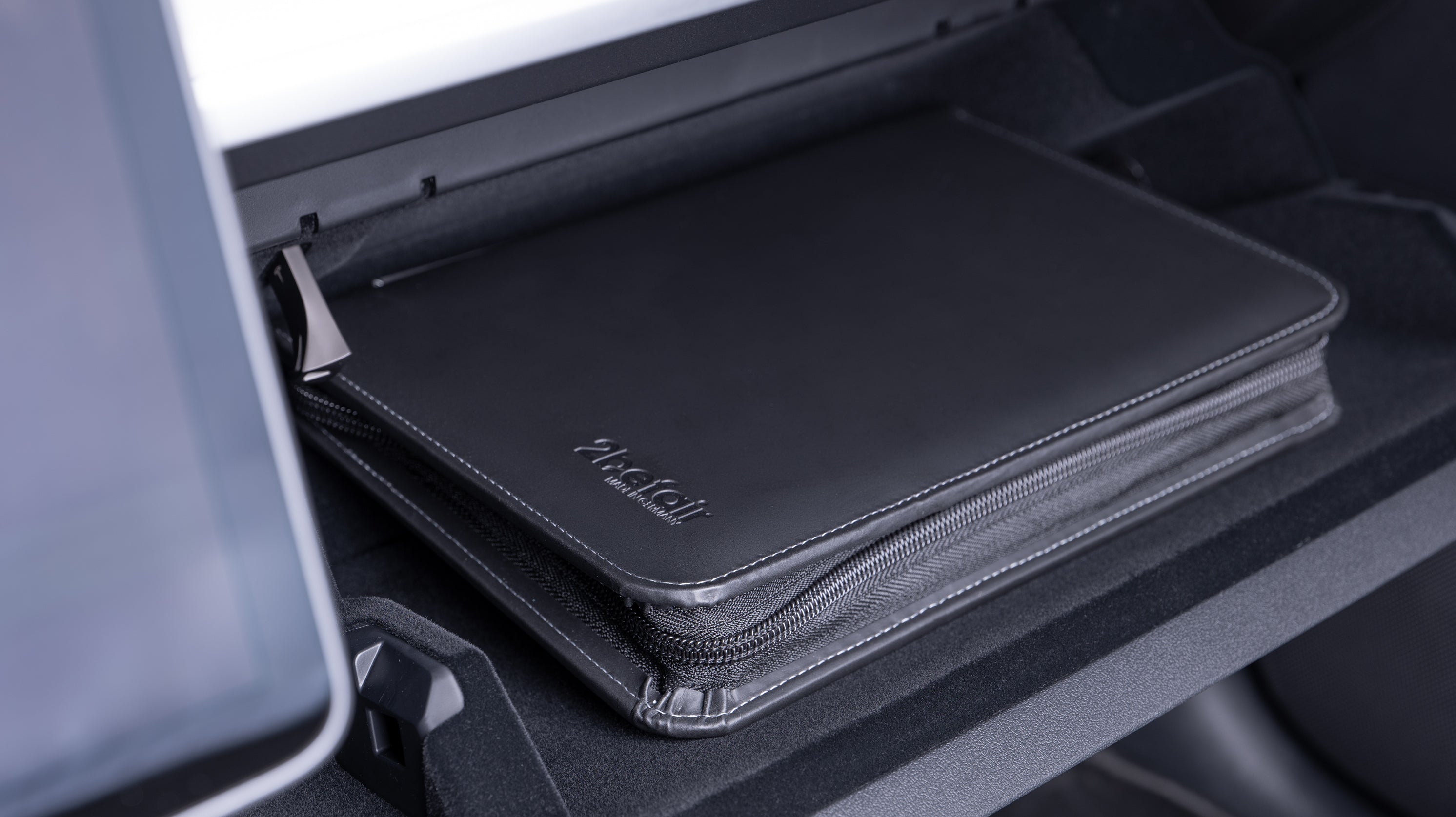 Die Maße der Bordmappe betragen 24 x 16,6 x 2,5cm. Damit ist sie perfekt an die eher kleinen Handschuhfächer von Tesla angepasst. Natürlich passt sie aber auch in die meisten anderen Fahrzeuge oder auf den Schreibtisch.