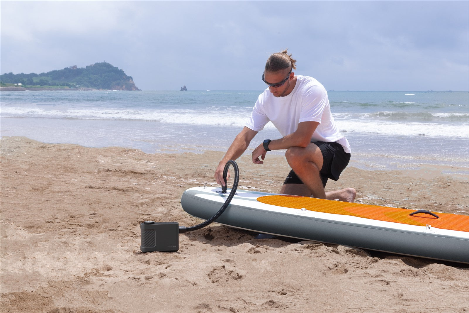 The scope of delivery includes 12 accessories such as different nozzles, air hose, power adapter and a practical transport bag. The Air Pump Master pumps at an impressive speed. A SUP in 15 minutes, a tent in 8 minutes or a SUV tire in just 80 seconds-a versatile helper for every situation.